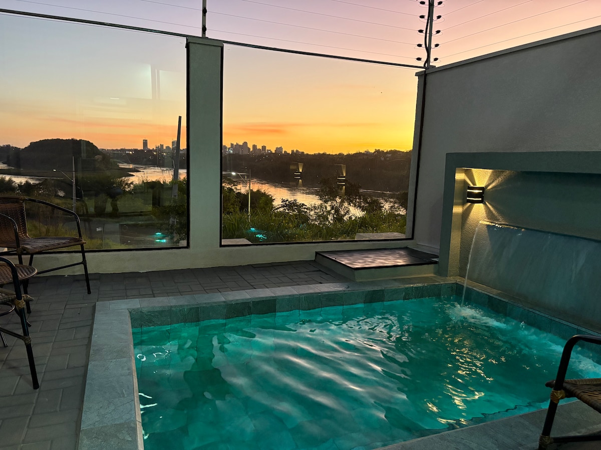 Com uma vista panorâmica incrível, que abrange o majestoso Rio Paraná, a imponente Ponte da Amizade, a charmosa Ilha Acaray e uma super vista panorâmica que conecta dois países — Brasil e Paraguai. Um cenário perfeito para relaxar com estilo e tranquilidade. Além disso, aproveite o conforto de uma piscina e a serenidade de uma vista privilegiada para a natureza. Localização estratégica: a apenas 9 minutos da Usina de Itaipu e 3 minutos do Templo Budista. Um refúgio perfeito para o seu descanso!