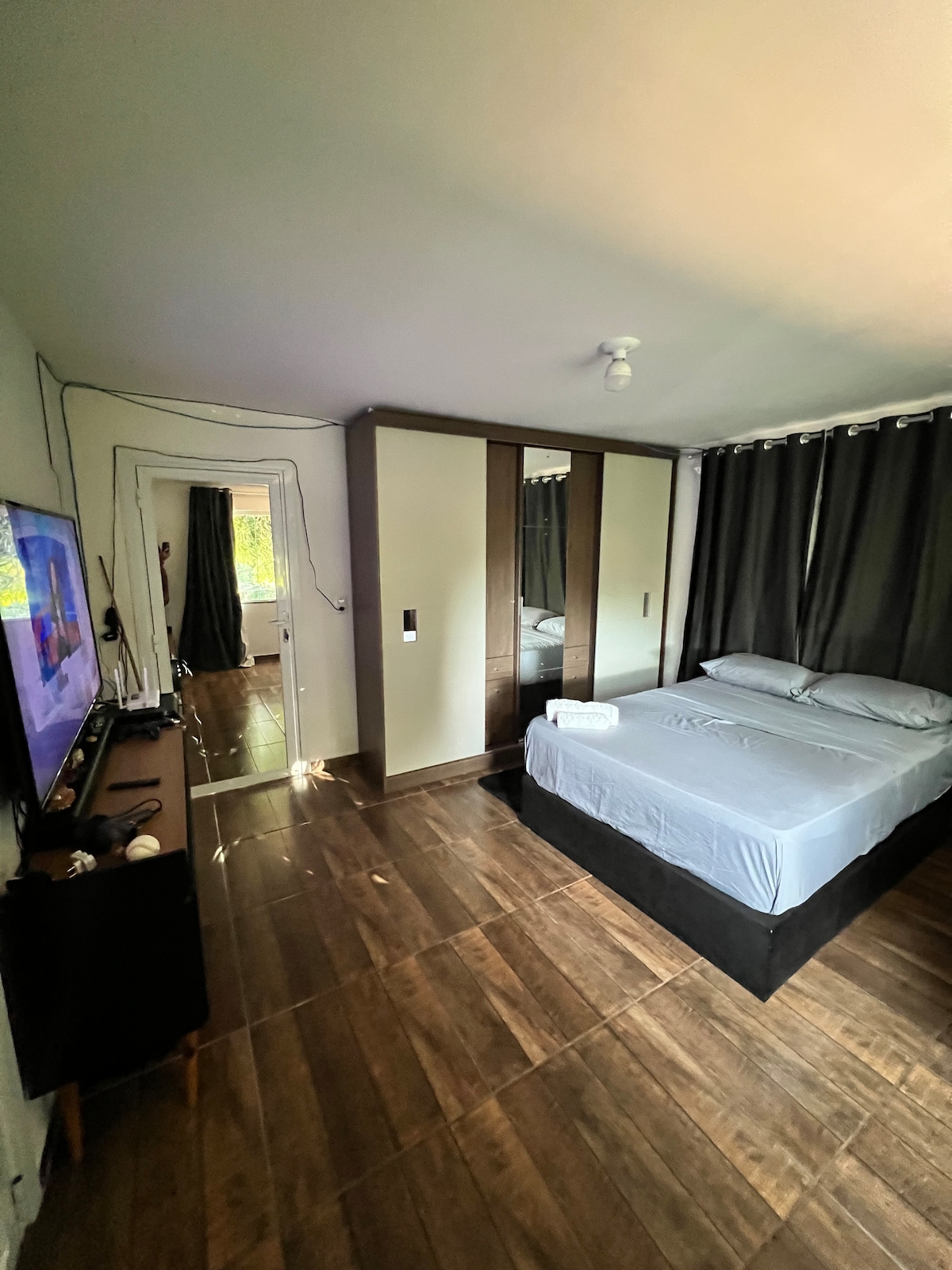 Relaxe com toda a família nesta acomodação tranquila. Com uma cozinha, microondas, chaleira elétrica, cafeteira, frigobar e utensílios de cozinha (copo, pratos, xícaras e talheres), mesa para 6 pessoas, sala com sofá cama para 4 pessoas com ar e tv, quarto privativo com cama king, ar e Tv tb, closet, pia, chuveiro e vaso sanitários, todos separados (o que facilita o uso simultâneo), roupas de cama, 1 limpeza geral inclusa na senana e demais dias trocas normais, toalhas banho para piscina/praia
