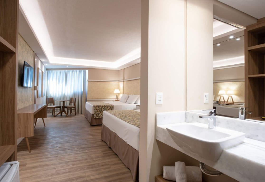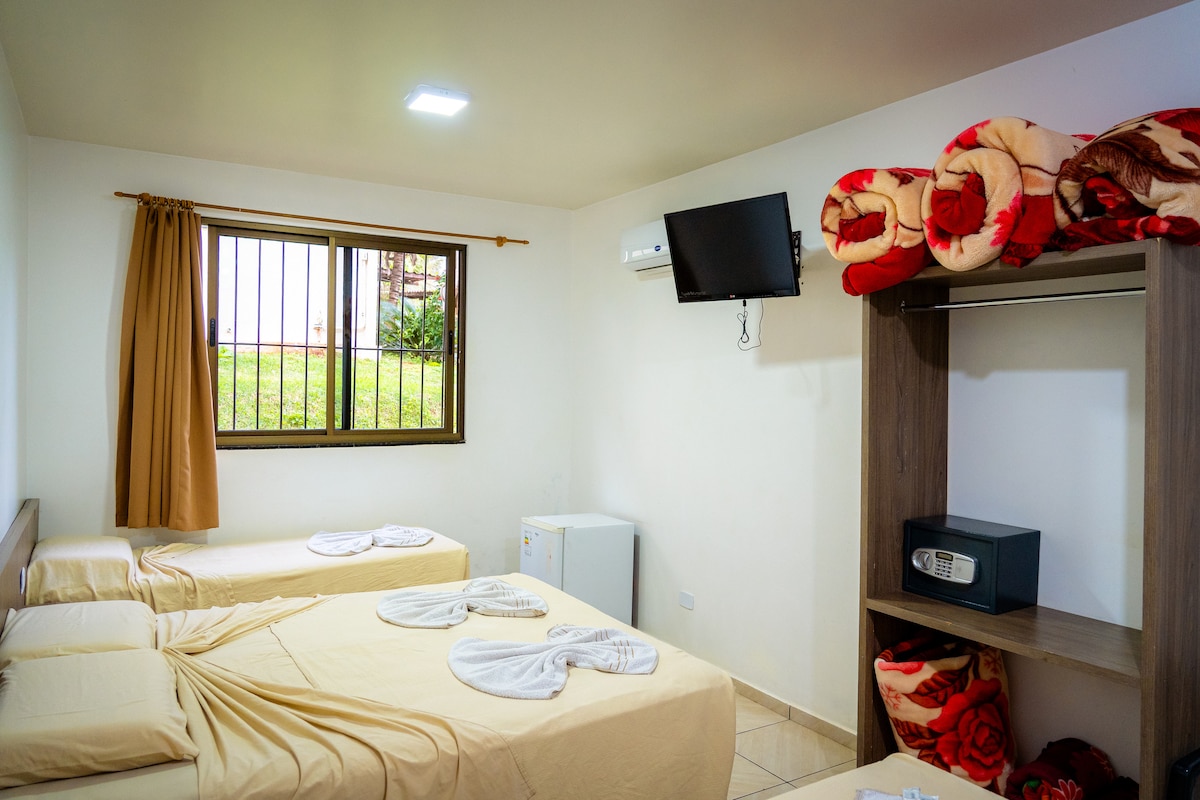 A suíte contém uma cama de casal Queen. Possui Wi-Fi, ar-condicionado, TV smart e cofre. O banheiro privativo inclui toalhas, shampoo, condicionador, sabonete e secador de cabelo. O complexo está localizado na Avenida das Cataratas e oferece facilidades para sua conveniência. No prédio, você encontrará lavanderia self-service, casa de câmbio, agência de turismo, locação de veículos, Subway e conveniência 24 horas com caixa eletrônico para operações bancárias a qualquer momento.