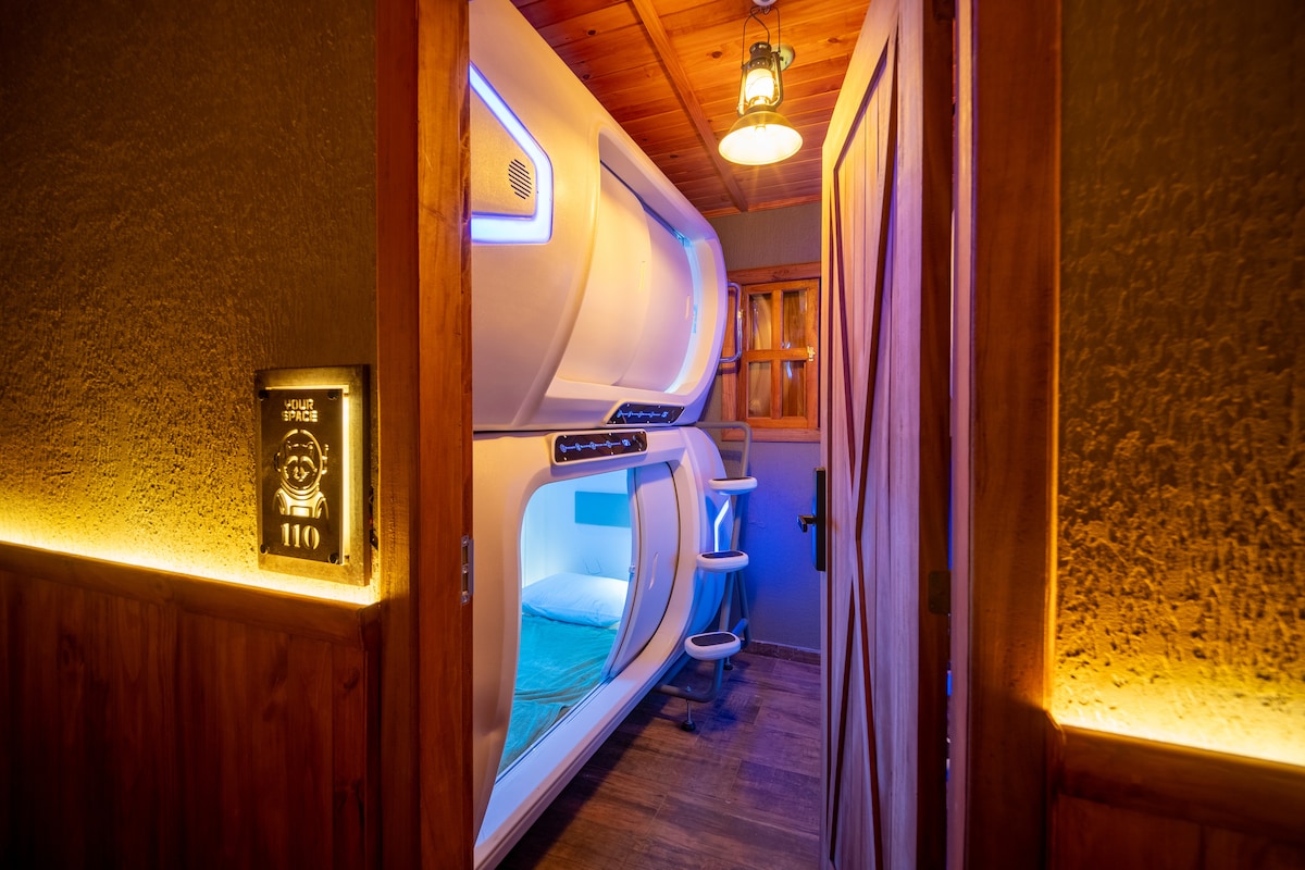 Você já imaginou se hospedar em uma cápsula futurista, com conforto, privacidade e tecnologia, no coração de Foz do Iguaçu? No The Lodge Iguassu o destaque é a experiência única de dormir em cápsulas futuristas individuais com conforto que combinam design moderno, luzes suaves, ventilação individual, tomadas, espelhos e tudo que você precisa para descansar com estilo. Envolto por um ambiente acolhedor de cabana, o The Lodge oferece o equilíbrio perfeito entre natureza e inovação.