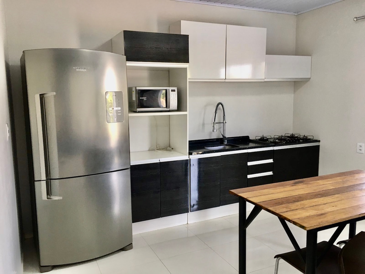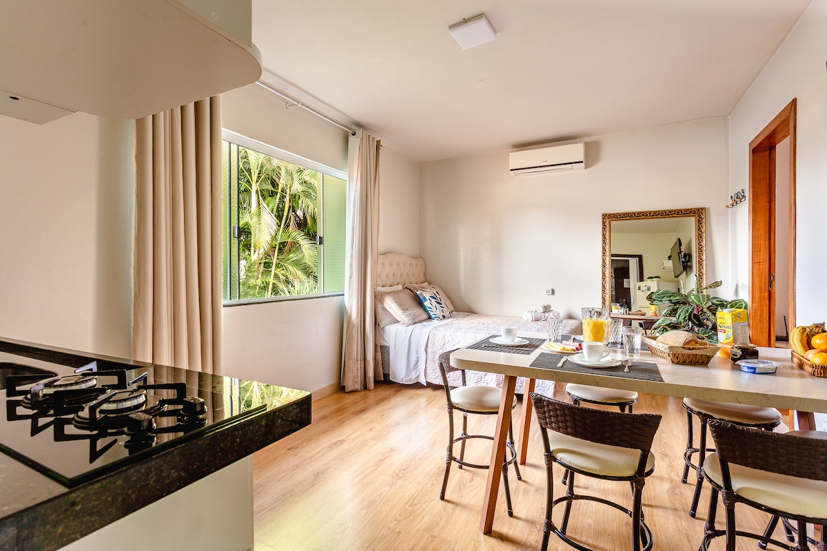 Ambiente individual com cozinha equipada. Quarto e sala conjugados com sofá-cama, cama queen e ar condicionado. Banheiro limpinho, lavanderia com tanquinho e varal. Lugar tranquilo e bem-localizado.