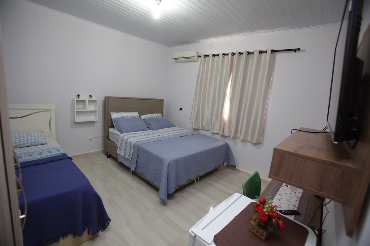 Suíte aconchegante, possui 1 bicama ou (2 camas de solteiro), e 1 cama de casal com colchão queem size ,tv de led com wifi, localizado bem próximo do centro mas com muito silêncio durante a noite para que sua noite seja tranquila e seu sono seja renovador para que vc possa estar descansado para conhecer as belezas da nossa cidade