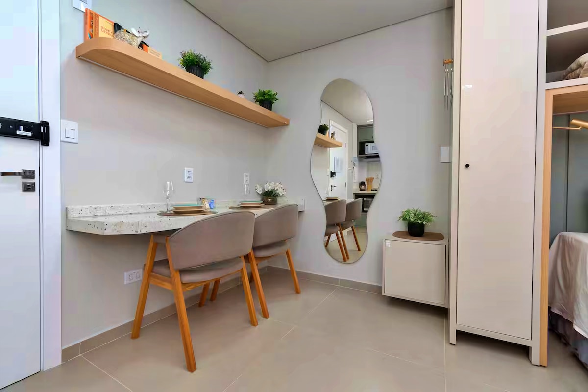 Studio novo muito bem localizado com: ar condicionado que cobre todo ambiente além de wi-fi e smart tv Ideal p/ até 2 pessoas, roupa de cama e toalhas de banho são fornecidas O banheiro possui toalheiro térmico Fácil acesso às famosas Cataratas do Iguaçu e a fronteira com o Paraguai Algumas distâncias: 6,6km Ponte da Amizade - Paraguai 8,5km Ponte Tancredo Neves- Argentina 13,0km Centro Visitantes Itaipu Binacional 14,8km Parque das Aves 15,1km Centro de visitantes Cataratas de Iguaçu