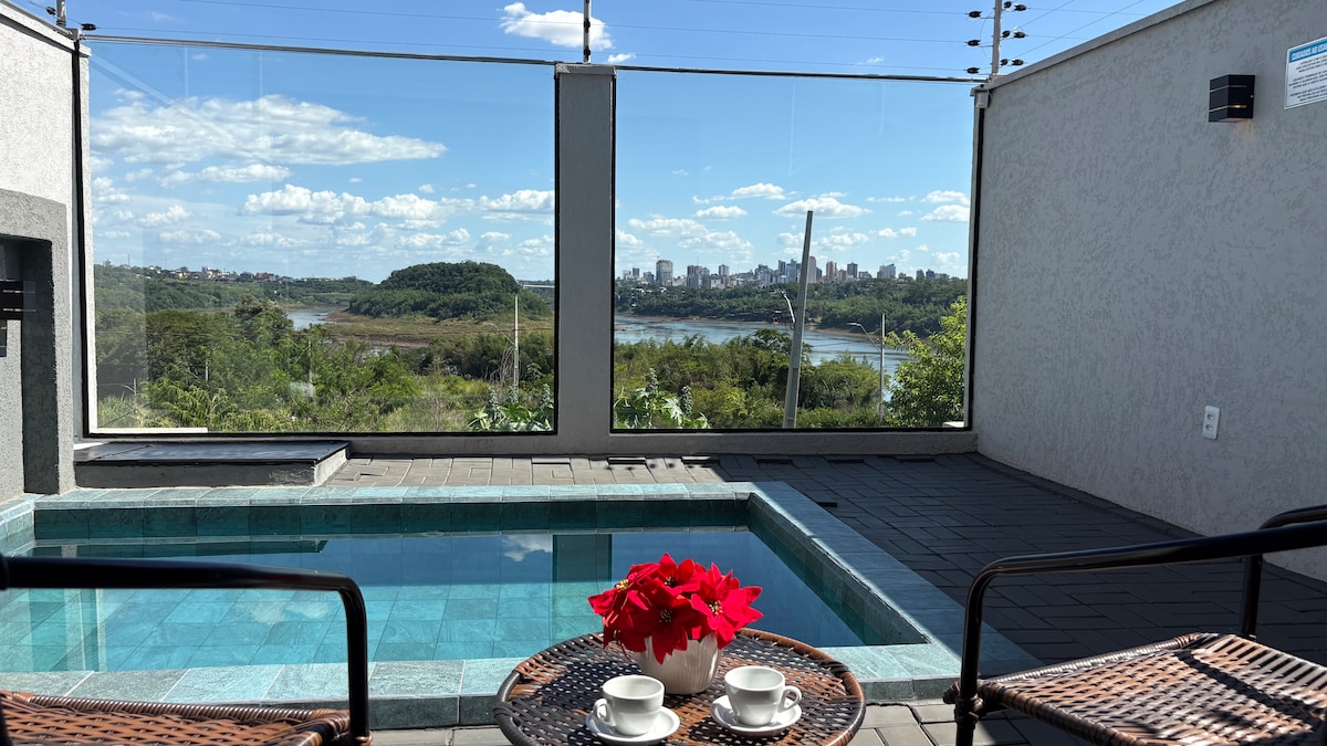 Com uma vista panorâmica incrível, que abrange o majestoso Rio Paraná, a imponente Ponte da Amizade, a charmosa Ilha Acaray e uma super vista panorâmica que conecta dois países — Brasil e Paraguai. Um cenário perfeito para relaxar com estilo e tranquilidade. Além disso, aproveite o conforto de uma piscina e a serenidade de uma vista privilegiada para a natureza. Localização estratégica: a apenas 9 minutos da Usina de Itaipu e 3 minutos do Templo Budista. Um refúgio perfeito para o seu descanso!