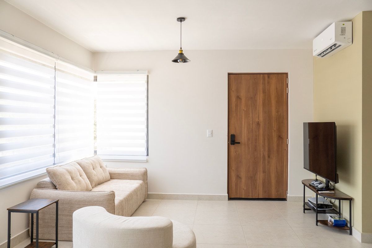 Acogedor departamento totalmente nuevo y equipado en ubicación céntrica. ¡Bienvenido/a a nuestro encantador departamento en el corazón de Tepic! Este apartamento completamente nuevo y equipado es el lugar perfecto para disfrutar de una estancia cómoda y conveniente en una de las colonias más céntricas de la ciudad. Ubicado en la planta alta, cuenta con dos recamaras con aire acondicionado cada una, espacio de cocina totalmente equipado, baño, sala, espacio de trabajo, lavadora y balcón