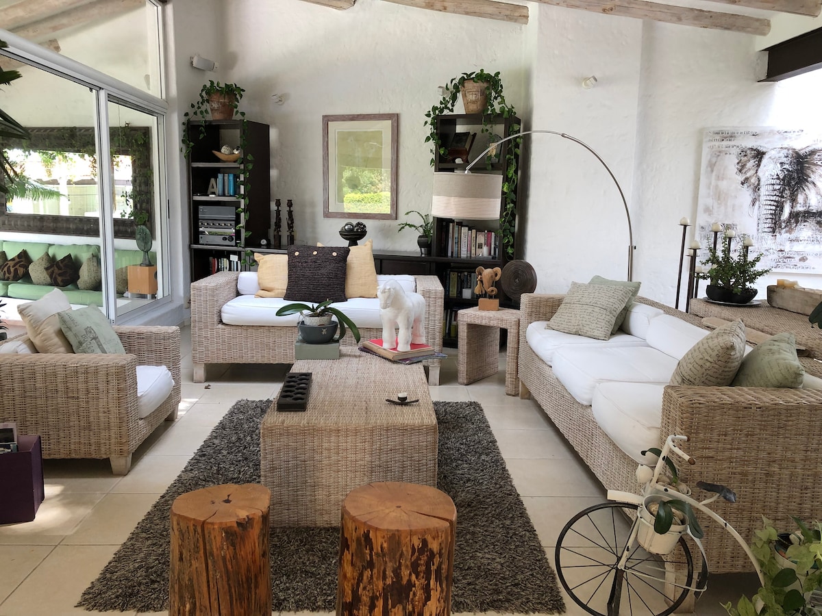 Espléndida residencia estilo Barragán con amplios espacios, iluminada y fresca, con vestíbulo, sala, comedor y cocina equipada. Cuenta con 4 habitaciones, cada una con baño completo y 3 de ellas con TV de paga, A/C en sala y comedor, garaje para 3 vehículos, alberca, hermoso jardín, parrilla y terraza. Calefacción de alberca NO incluida en la tarifa de hospedaje (contratación opcional). La arquitectura y armonía del inmueble generan distintos espacios propicios para el descanso y esparcimiento.
