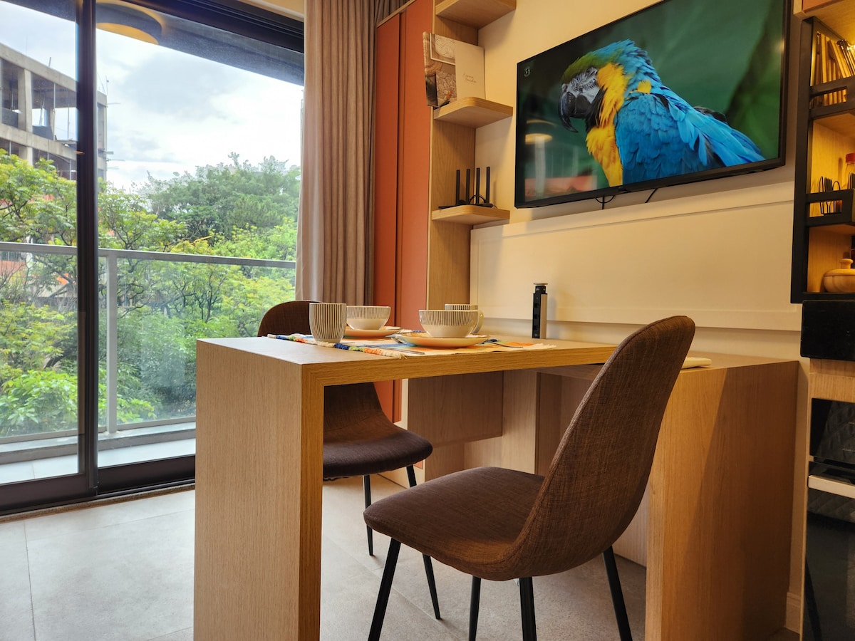 Enjoy an elegant experience in this modern studio with a strategic location in front of the Eldorado Shopping Mall, easy access to the subway stations - 700 m walk from the Faria Lima station, 500 m walk from the Hebraica Rebouças station, and 10 min drive from USP, 15 min from Parque Vila Lobos, Parque do Povo, Vila Madalena (the best area for bars and restaurants in São Paulo). Welcome and come enjoy a structure ready to make you feel at home. Unfortunately the building does not have parking