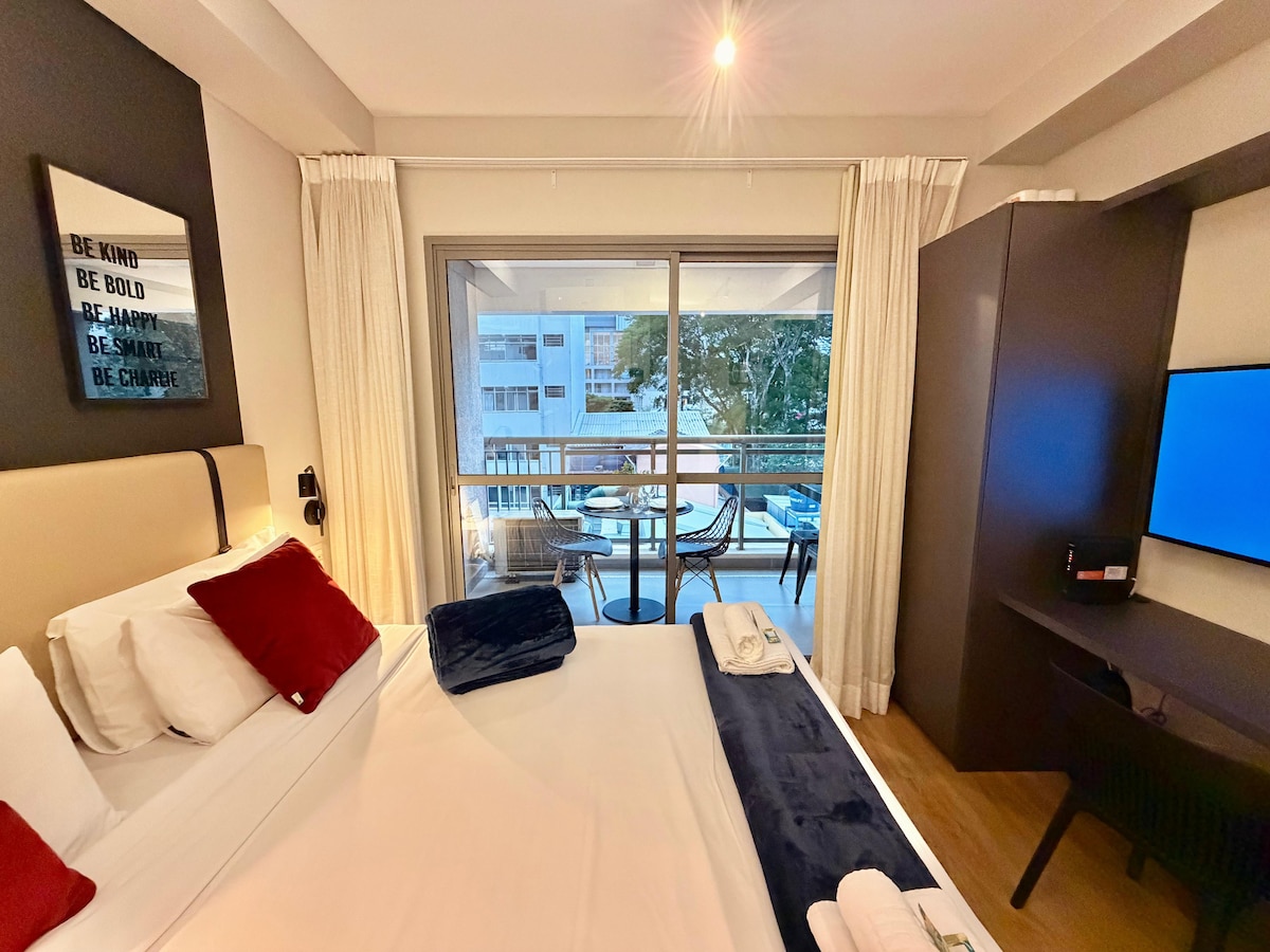 Relax in the best location of São Paulo, between Jardins and Pinheiros. This newly opened studio is a 5-minute walk to the Oscar Freire subway station, in a new building with all the infrastructure for a quiet and comfortable stay. It is on top of a bakery with artisan bread and across the street from a supermarket. The building has coworking and coliving space, laundry room, gym, rooftop pool, and a 24-hour doorkeeper. Wi-Fi 450Mbps.