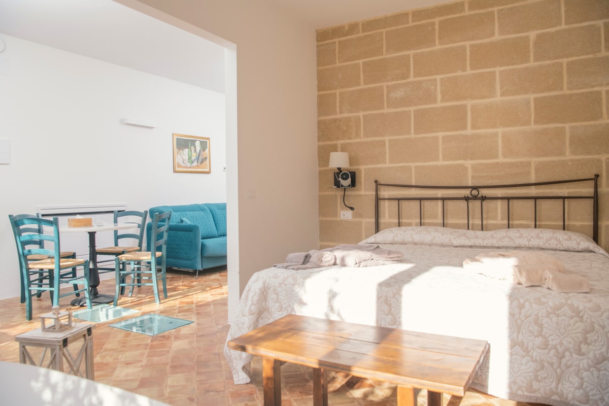 This unique space, carved inside traditional trulli, has its own charm and lets you experience the true spirit of the Itria Valley. You enter through an old strawberry‑grape pergola. The kitchen and bathroom are set in the alcoves, while the dining and sleeping areas are located in a saracen trullo and a tall‑cone trullo. The private patio and nearby infinity‑edge pool offer views of the valley and the skyline of Ceglie Messapica.