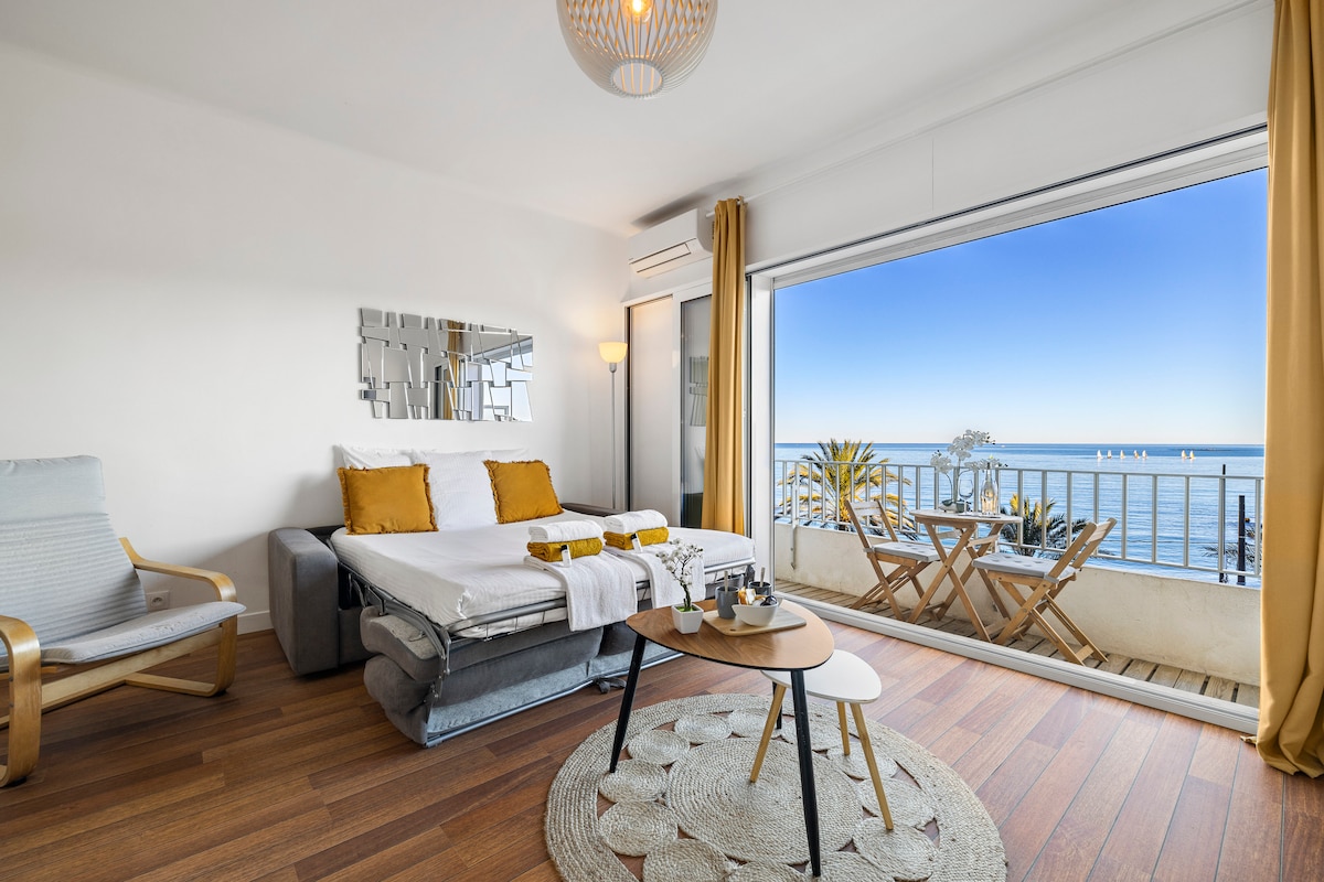 Studio cosy et parfaitement situé en plein front de mer avec une vue imprenable sur la mer et le Cap d'Antibes. Vous l'apprécierez à la fois pour son emplacement face à la mer, avec un accès direct aux plages de l'Ilette et de la Salis et à la fois pour sa proximité avec la vieille ville et ses rues typiques, ses remparts, son port et ses restaurants. Situé sur une promenade reliant la vieille ville d'Antibes au Cap d'Antibes, vous profiterez d'un séjour en toute quiétude les pieds dans l'eau.