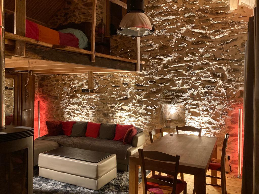 Unconventional accommodation in a green setting. You will hear the sound of birds and the song of the stream for a guaranteed rest with no other noises than those of nature. A romantic getaway as well for a cozy evening by the stove in winter or on a sunny terrace in summer. The rustic and minimalist aspects are also highlighted: dry toilets, reduced surfaces and layouts but executed with taste and simplicity.