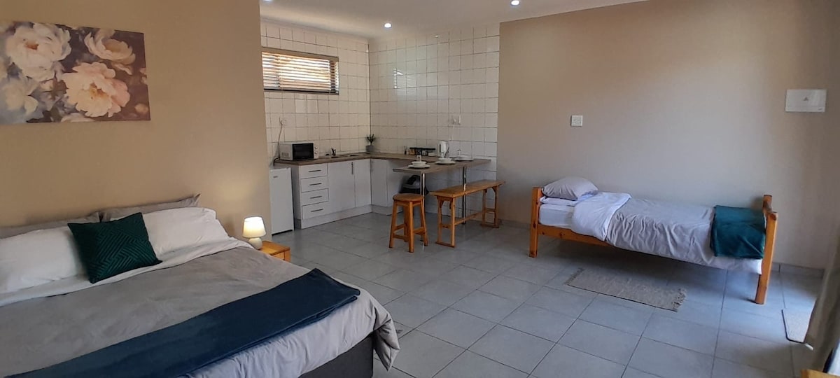 Ideally situated, centrally-located One bedroom with an en-suite bathroom. Separate entry. We are about 10 min drive from Kimberley Airport, connecting the N8 and N12. Whistling Kettle Coffee shop and Annique Beauty & Day Spa across the street. Diamond Pavilion Mall about 250 metres away. 7 min drive from Mediclinic Gariep, NC Mall, Suzuki Stadium, Sol Plaatje University and Schools