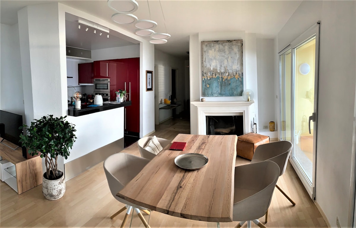 Appartement d'exception avec vue panoramique sur le lac Léman et les montagnes environnantes. Sans vis-à-vis, il saura vous séduire par la verdure et le calme environnant. L'appartement est situé dans un quartier résidentiel sur les hauteurs de Thonon-les-Bains surplombant le centre ville. Il est idéal pour les vacances d’été et d'hiver avec la proximité des pistes de ski toute proche ainsi que l’accès au lac. (2 vtt, 1 canoë, 1 paddle à disposition, TV accès Netflix)
