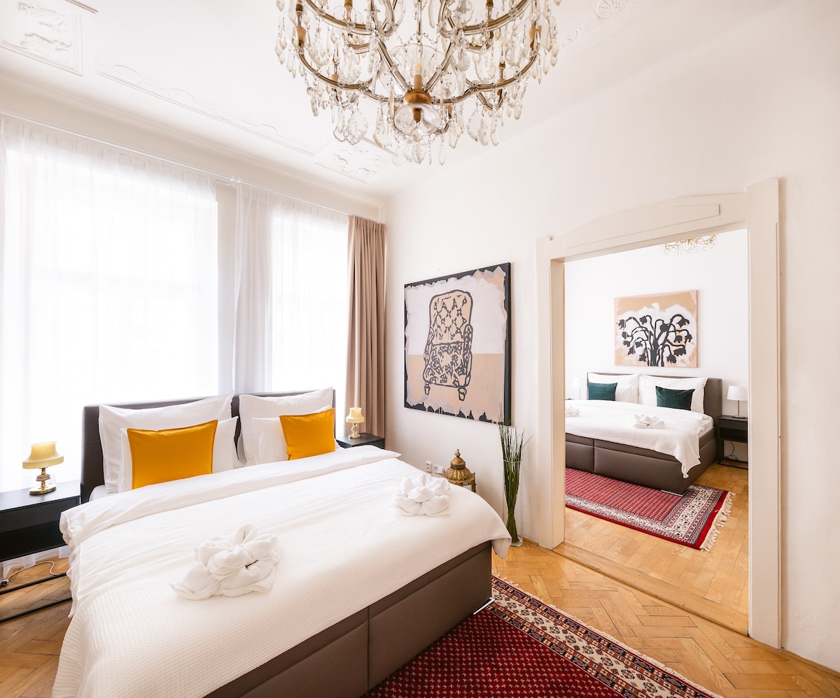 ★ Historic House ★ Original Furniture and Art ★ Kitchen ★ High-speedWiFi ★ Experience the original atmosphere of a baroque building in Prague downtown. The apartment with furniture from the 'fin de siècle'' epoch has a large bathroom, cloakroom and conservatory. Big enough for four guests, modern, equipped kitchenette, king size bed and convertible sofa. Washer/dryer, Wi-Fi, Netflix TV provided. Hope that original art and Persian rugs from family collection will make your stay pleasant.