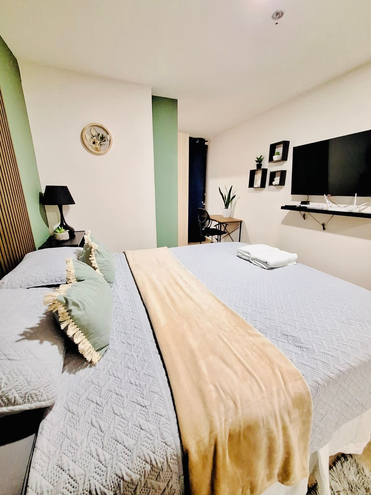 Apartamento Mono_ambiente, una habitación privada con cama Queen que cuenta con un pequeño espacio para cocinar, ubicado en el primer piso del edificio, tipo habitación de hotel pero con su propio espacio privado sin compartir con otros huéspedes. El complejo cuenta con área verde, piscina que es de uso exclusivo únicamente para residentes.