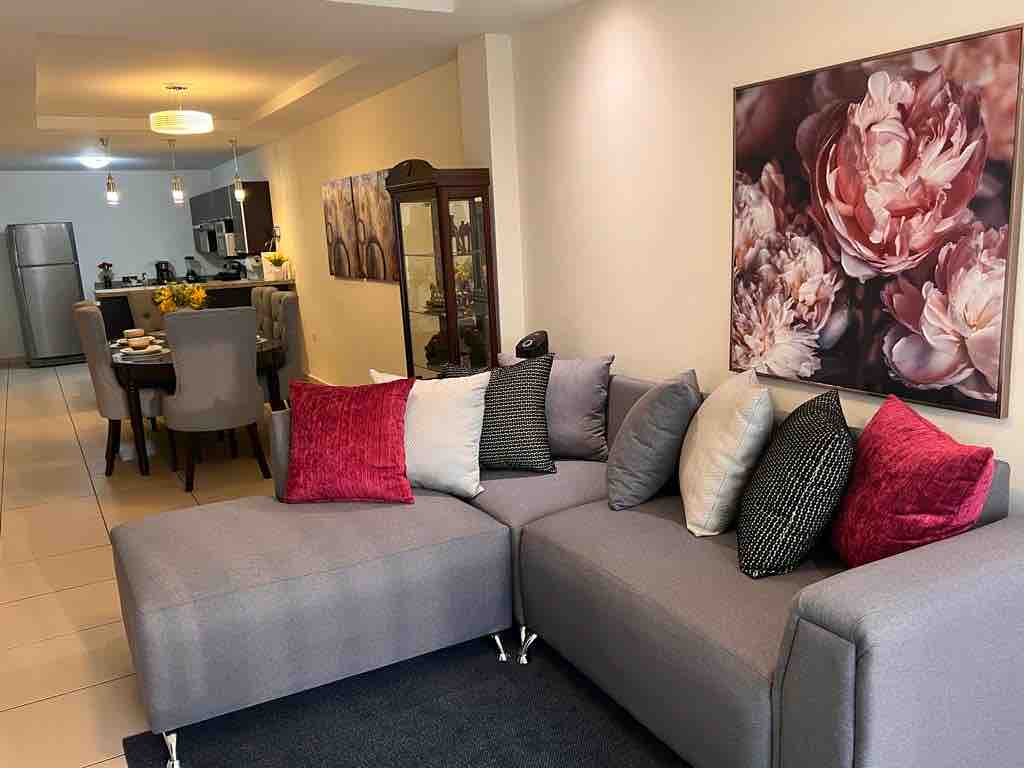 • Furnished terrace + complimentary coffee to unwind • Luxurious and safe apartment • 15 minutes from the U.S. Embassy • 2 bedrooms, each with a private bathroom, blackout curtains, and A/C • Fully equipped kitchen • Free washer and dryer • 3 Smart TVs with Netflix • Ideal location: walk to Multiplaza Mall, banks, and restaurants • Perfect for 4 guests (up to 5: 1 on the sofa) • Pets welcome!