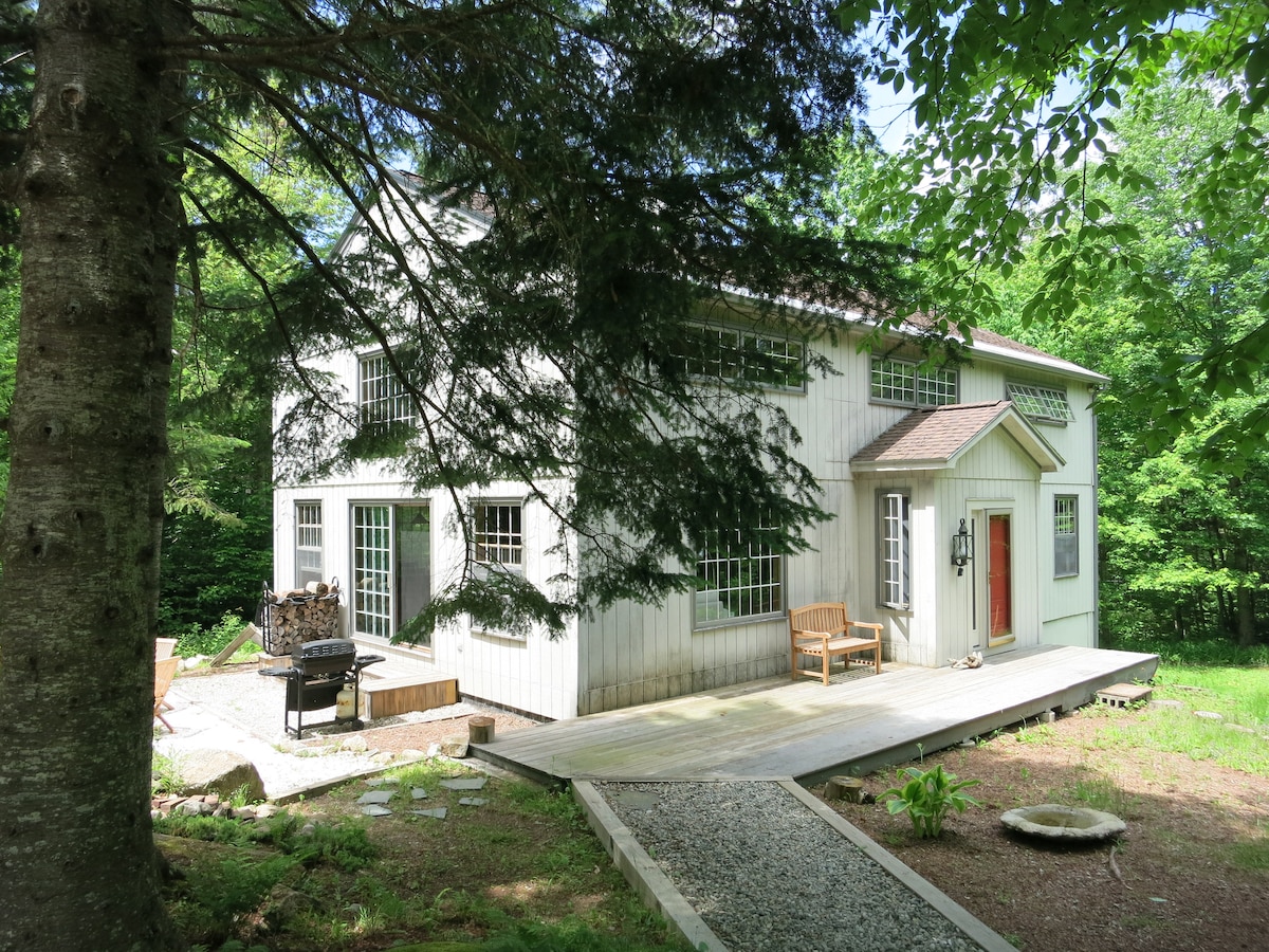 The cozy Bow House is perched up above a lovely valley and boasts large south facing windows, a unique bowed loft and a warm, inviting space to relax. Up a charming dirt road past Brushwood & Fairlee Forests with hiking, biking and ATV trails nearby. Lake Fairlee is a scenic 10 min drive; 15 min to Lake Morey & I-91 and 30 min to Dartmouth College. Enjoy the glow of the rising sun and beautiful views above the fog, unwind in the hot tub surrounded by the magical woods and wildlife of Vermont.