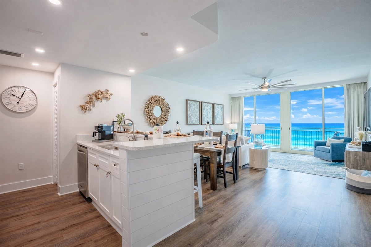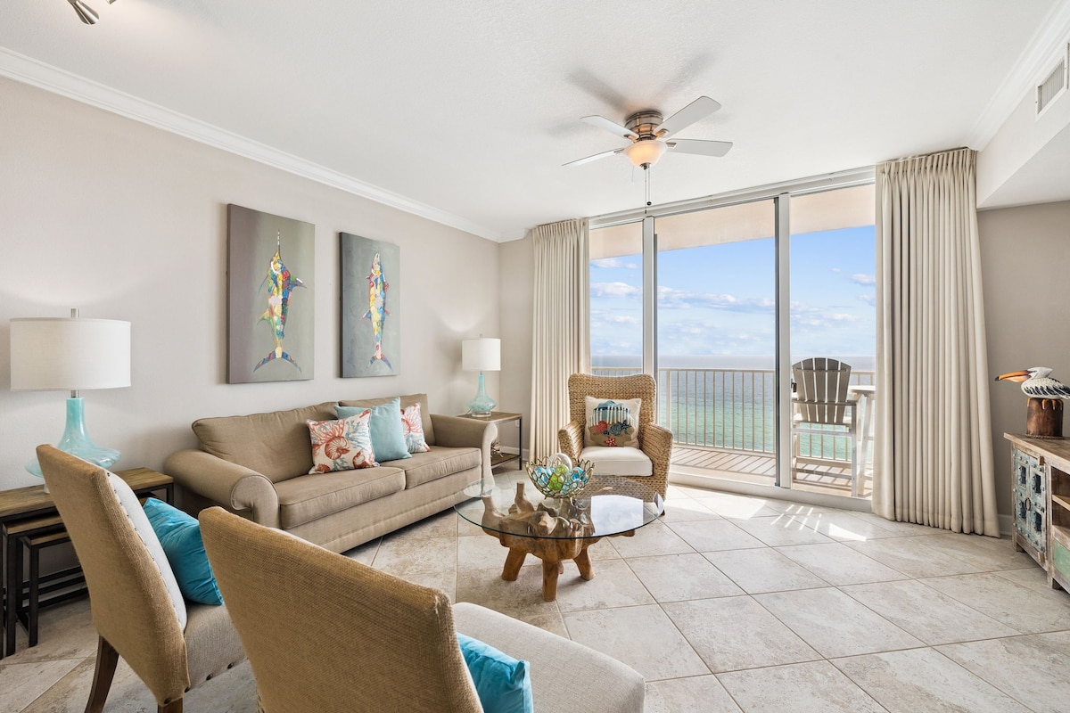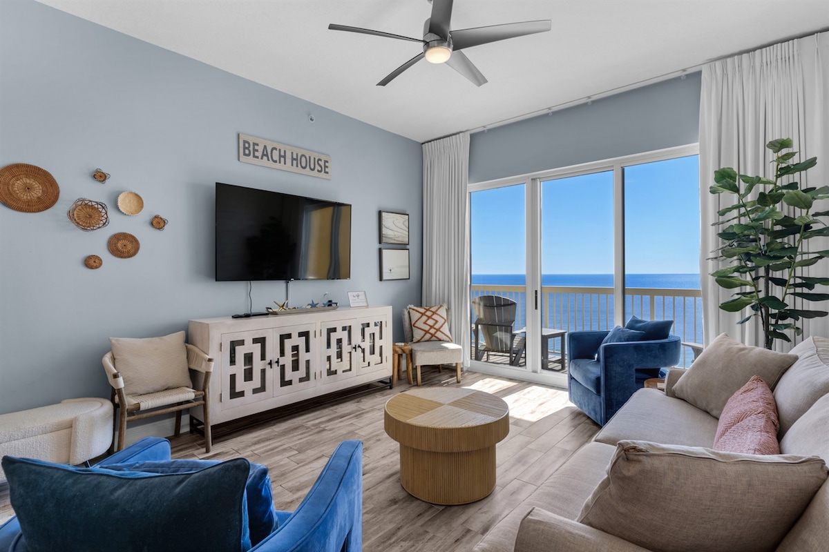 This 7th-floor corner unit condo at Tidewater Beach Resort offers breathtaking panoramic views of the endless shoreline of the emerald Gulf Coast. From the private balcony or the comfort of the living room sofa or dining table, enjoy stunning sunsets over the ocean and dazzling city lights at night. Resort boasts incredible amenities, including two lagoon-style pools, a heated indoor pool, hot tubs, a state-of-the-art fitness center with a Roman spa, a movie theater, and private beach access.