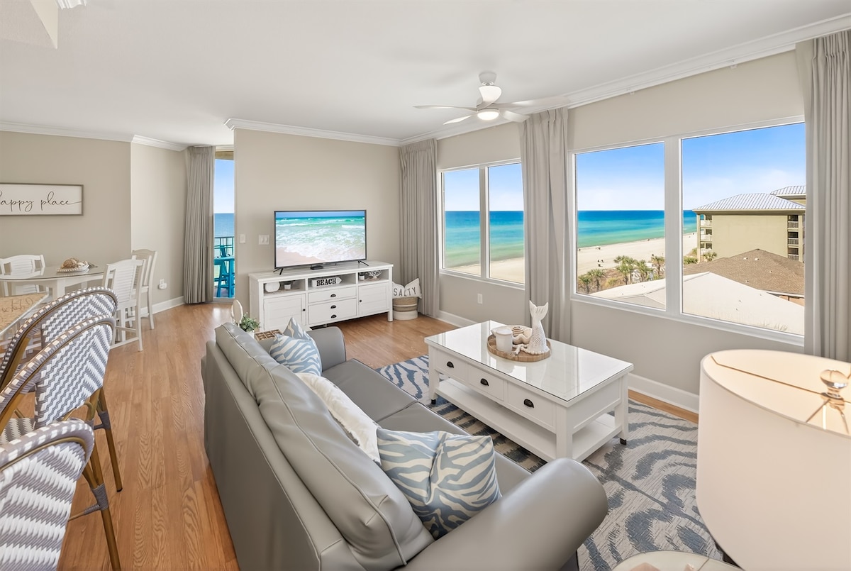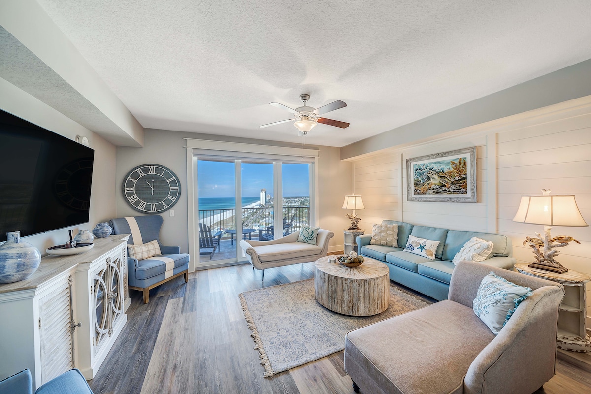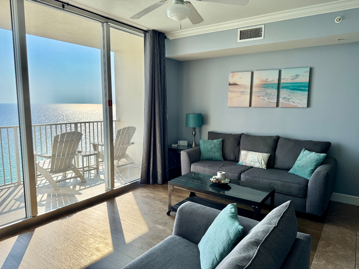 Relax on this units spacious balcony and watch the ocean waves crash underneath the sunset! The 3 bedroom unit sleeps 8 with a King bed in the master and 2nd bedroom, and Twin/Queen bunk bed in the third bedroom. Full kitchen with essentials, full sized refrigerator, washer and dryer. Fully vacation ready! Located just steps to the World's Most Beautiful Beaches. You will also only be a 5 minute walk to the pier, restaurants, shopping and activities of Pier Park! Read More Here!