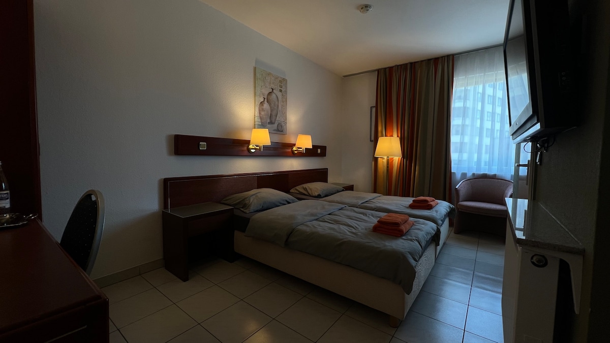 Dieses Hotel liegt in der Stadt Rüsselsheim, 15 km vom Flughafen Frankfurt und Mainz entfernt. Freuen Sie sich auf große Zimmer, kostenfreie Parkplätze und eine gute Anbindung an die Autobahn A60. Alle Zimmer verfügen über Sat-TV, WLAN und ein eigenes Bad. WLAN nutzen Sie in der Hotelbar und in allen anderen öffentlichen Bereichen kostenfrei. Die Frankfurter Innenstadt und die Frankfurter Messe sind eine 25-minütige Fahrt entfernt.