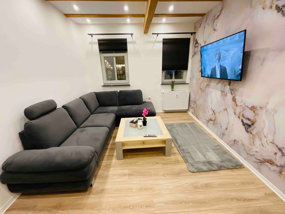 Die Unterkunft ist geeignet für Paare, Geschäftsreisende gerne auch Monteure und Familien (mit max. 2 Kindern). Das Apartment kann auch nur von Montag bis Freitag gebucht werden. Anfrage über Airbnb . Das komplett eingerichtetes Apartment befindet sich im 1 Stock des zweistöckigen Hauses. Das Apartment hat 1 Boxspringbett 140 cm im Schlafzimmer und eine Schlafcouch 130cm im Wohnraum. Küche, Bad mit begehbarer Dusche und WC . • WLAN / WIFI kostenlos •Waschmaschine mit Trockner . • Bügeleisen