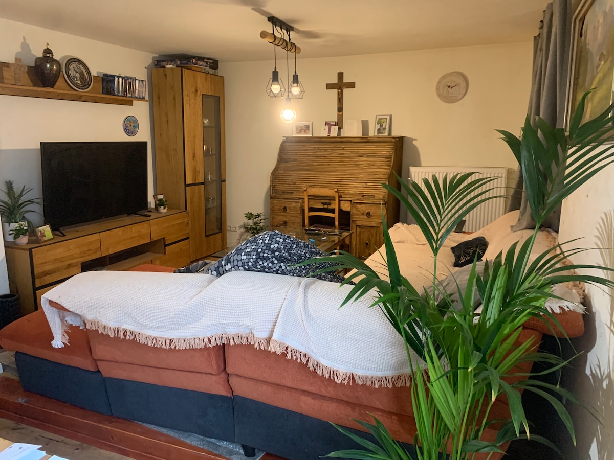 Sie wohnen im Erdgeschoss des neu umgebauten Wirtschaftsgebäudes eines alten Bauernhofes. Grosser Garten mit Paddock und 3 Pferden an einem kleinen Bach. Keine Angst darf man vor freilaufenden Hühner und unserem Herder Hund Jule haben. Es gibt eine zubuchbare Sauna und ein kleines Schwimmbecken. Sitzecke mit Feuerstelle im Garten kostenlos. Kosten für Sauna zusätzlich 15 € pro Saunagang für 2 Personen nur in Absprache vor Ort. ebenso zubuchbar ist spazieren mit den Pferden.