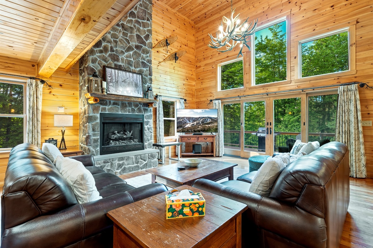 This newer Lodge finds itself nestled in the hills of Puzzle Mountain with an expansive and scenic view of all 8-peaks of Sunday River. Our Family Home offers exciting outdoor activities for any season with Sunday River, Grafton Notch State Park, Appalachian Trail and the Androscoggin within a 10 minute drive. The Great Room, and its knotty-pine ceiling, creates an inviting Chalet atmosphere that revolves around a grand stone fireplace--perfect for gathering after a long day of outdoor activity.