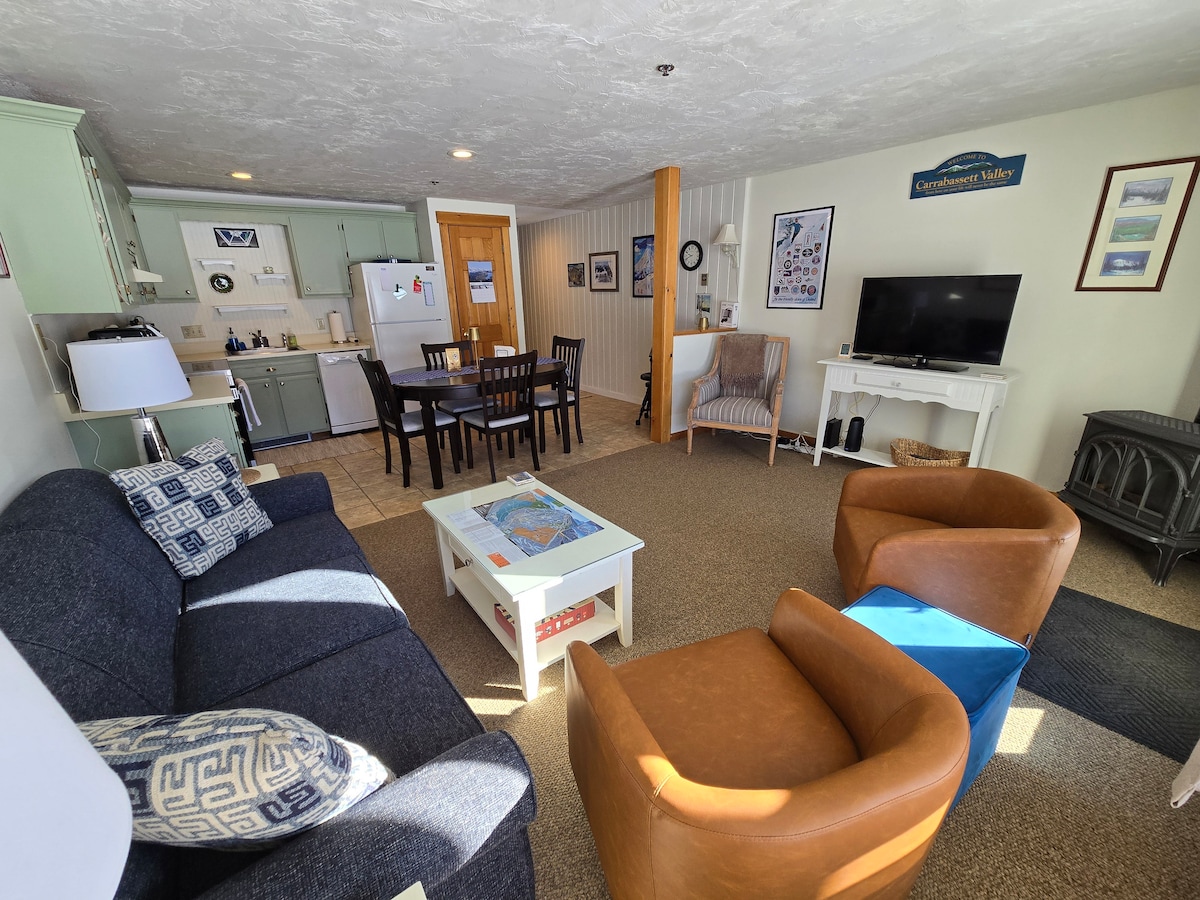 Pool Heater turns on 12/12/25! Pool hours 5pm-6pm Sun-Thur. 5pm-8pm Fri and Sat. Heated to 100 degrees. Feels like a hot tub. Why us and not on-mountain? Plenty of parking no permits to fill out! You can bring two cars. You can responsibly enjoy an adult beverage in our pool. We have A/C in the summer. This is a 2 bedroom unit with a queen pullout couch. 10 min drive to Sunday River. 5 min from Sunday River Brewing. 5 minutes from Grafton Notch State Park.