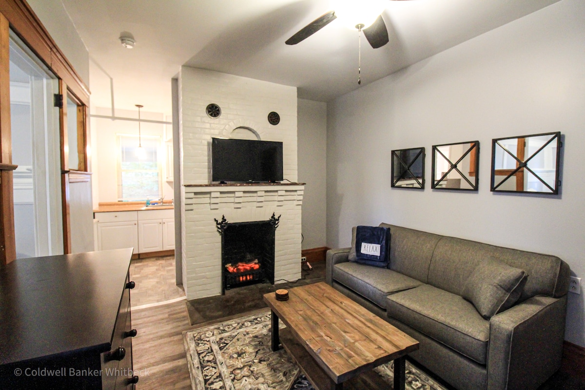 Totally remodled and fully furnished 1 bedroom apartment on West Main Street, downtown Malone in the Coldwell Banker building. This apartment comes fully furnished with new furiture as well as linens, towels and a fully stocked kitchen to serve four. Relax on the recliner or couch in front of a cozy fire . Queen bed in the bedroom and full pull out in the living room. Safe offstreet parking behind the building. Walk to restaurants and shops. Samsung smart TV and wifi provided.