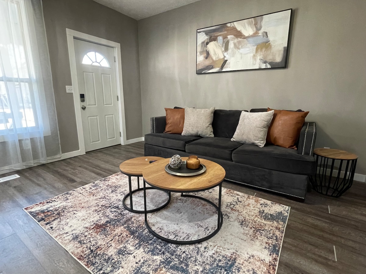 The Bexley Abode is in a prime spot: mins from attractions & highways but tucked in a quaint part of Cbus. It is home-y and conducive to a family or solo visitor. My husband & I remodeled and designed it with thought and sentiment. Highlights: ranch, open layout, cozy couch w/ 50" TV that swivels towards kitchen, gas fireplace, natural light, simple modern design finishes, new appliances, Keurig, hotel- style master bath w/ heated floor, kids room w/ toys/games, USB ports, WiFi, private parking