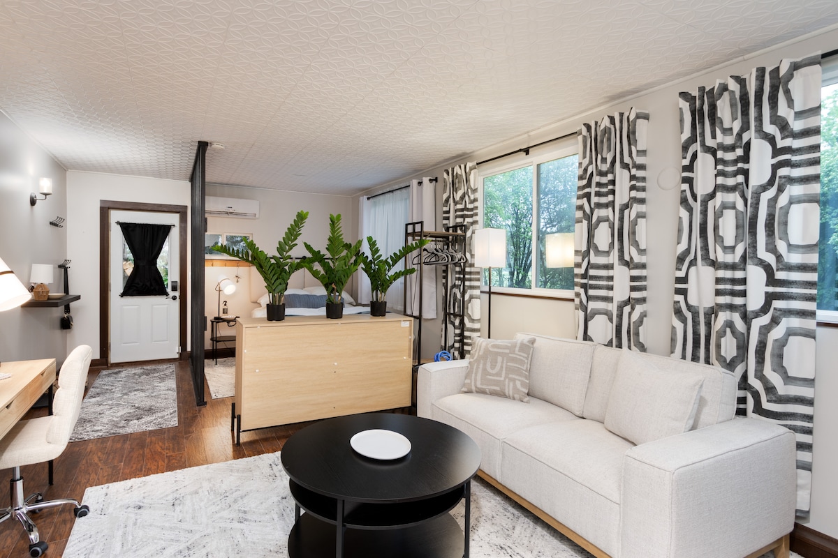 Welcome to our relaxing micro-studio just minutes from historic German Village and downtown Columbus. This thoughtfully designed tiny space features a queen murphy bed, modern kitchenette equipped with a Smeg mini fridge, private bathroom with a walk-in shower, smart TV, Wi-Fi, and heating/AC. Step outside and enjoy the spacious covered patio with comfortable seating, a firepit, and TV. Ideal for solo travelers or couples seeking a compact yet stylish retreat in a quiet, convenient neighborhood.