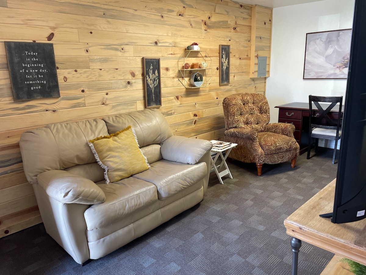 Forget your worries in this spacious and serene space. Feel comfortable knowing you have everything you need within reach. From grocery stores across the street to fast food steps away. Walking distance from the river and a short drive to a very popular park. We have free on site parking, in unit washer and dryer, a fully stocked kitchen and everything you may need in your home away from home. Whether you choose to go out or like to stay in we want you to feel comfortable and welcome.