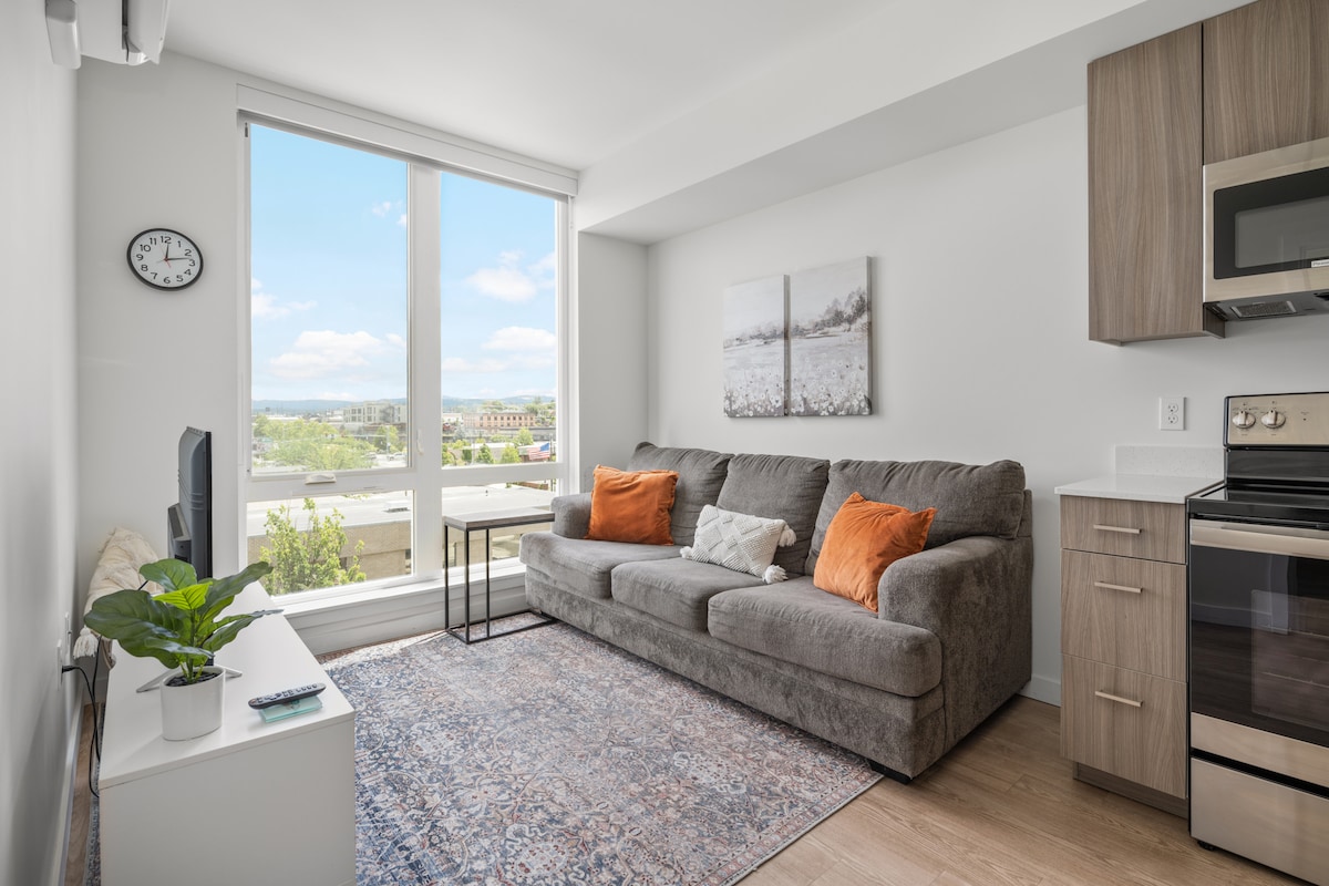 Experience Spokane in style in this elegant 2-bedroom, 2-bathroom apartment with AMAZING views! Located within a short walk to Downtown Spokane & Riverfront Park. The newly rennovated apartment includes an en suite Queen bedroom, open concept living space and a 2nd Queen bedroom and bathroom. The stylish apartment comfortably sleeps 4-perfect for traveling professionals, friends and family alike. Professionally designed and fullly stocked ensures a great stay in beautiful Downtown Spokane.
