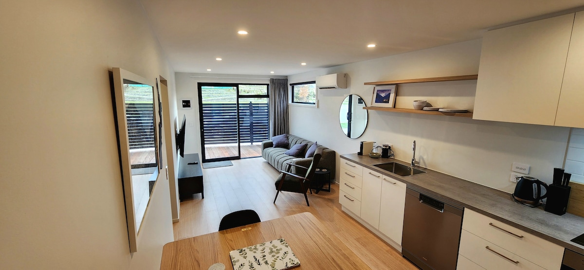 Studio apartment with incredible Mountain & Lake views. This stylish, warm studio has everything you need. Free on-site parking, unlimited WiFi, flat screen TV, floating floor boards, heating and it's only located 3.5kms from town center and only 1.2km from the airport. Great for a ski trip as it’s only 20 mins from top of Remarks and Coronet Peak. Suitable for a couple or a couple with a young small child. Any extra adults need to be approved and there may be a charge or $50 per night.