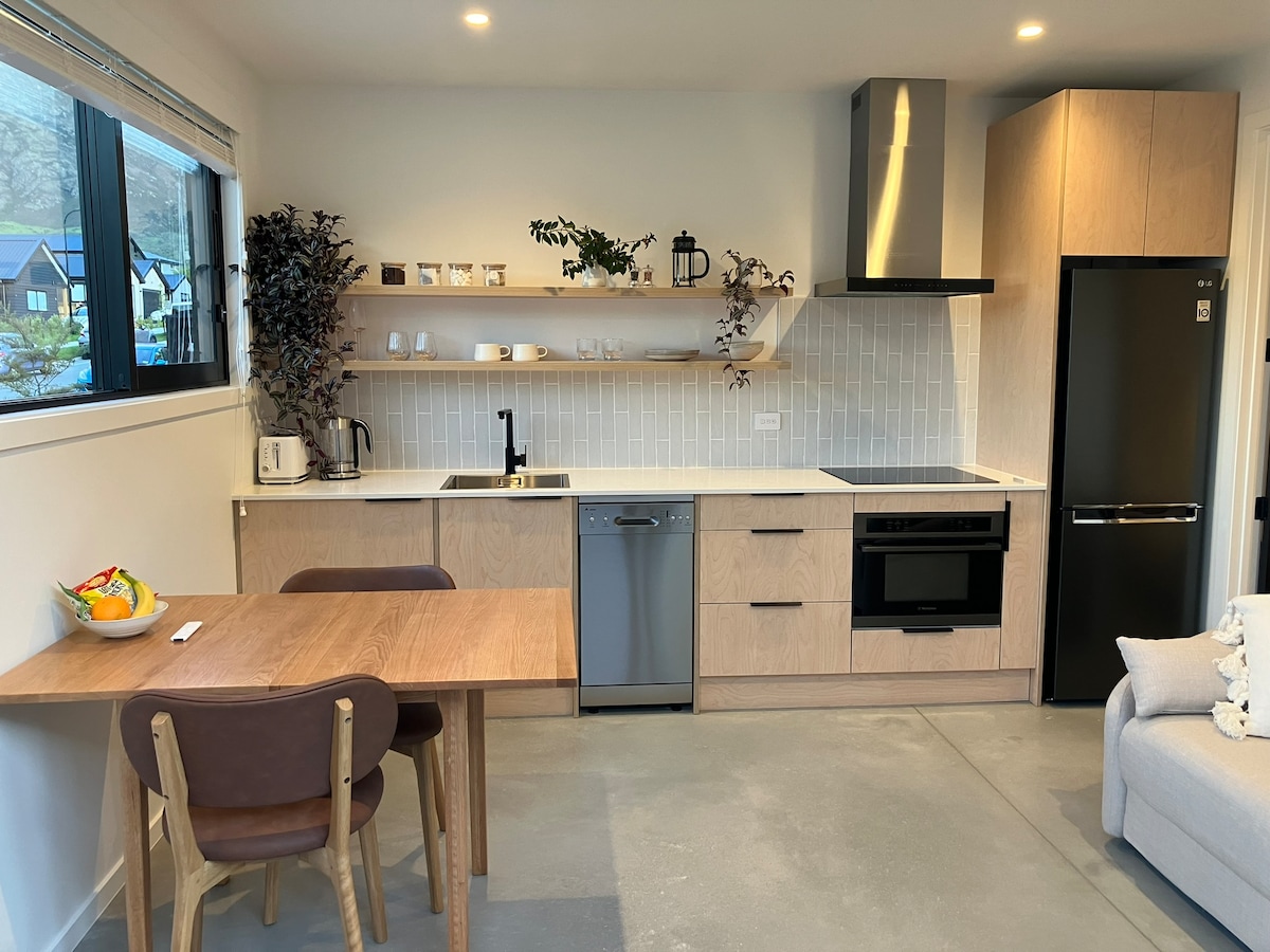 A self contained studio with queen sized bed, living area, kitchen & ensuite. A new build, this is a warm and cosy space in a private garden setting with spectacular mountain views and easy access to walks and trails in the Lower Shotover area. We are located 5 minutes from bus stop and a leisurely 10 min stroll to shops (supermarket, restaurants, cafes, etc). Hosts live on site and are happy to share their local knowledge.