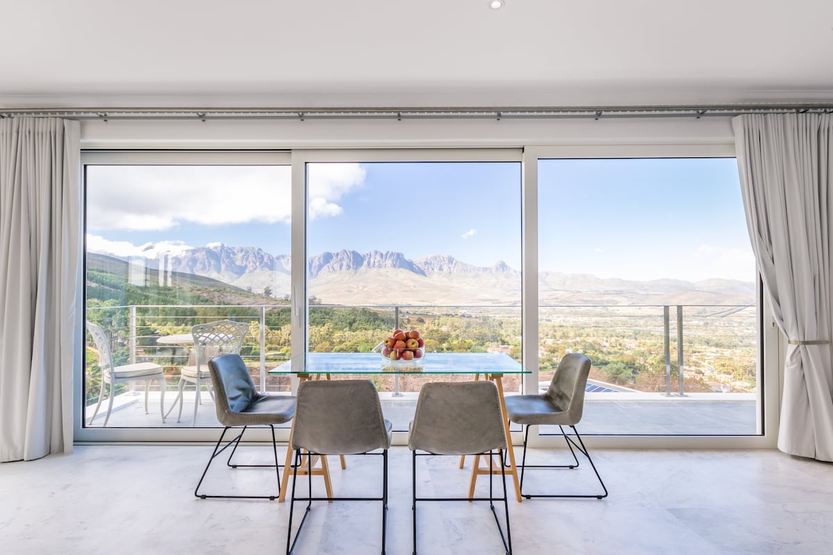 SOLAR Powered Enjoy breathtaking mountain views from one of the two balconies or curl up next to the indoor fireplace in this spacious open-plan apartment. French doors lead to both balconies that overlook the garden and olive orchard where you can enjoy a barbecue in your own private space. This tastefully furnished with stylish en-suite bathrooms is yours to make home away from home, whilst you enjoy the picturesque winelands and elegant restaurants. Seven minutes walk to the centre of town.
