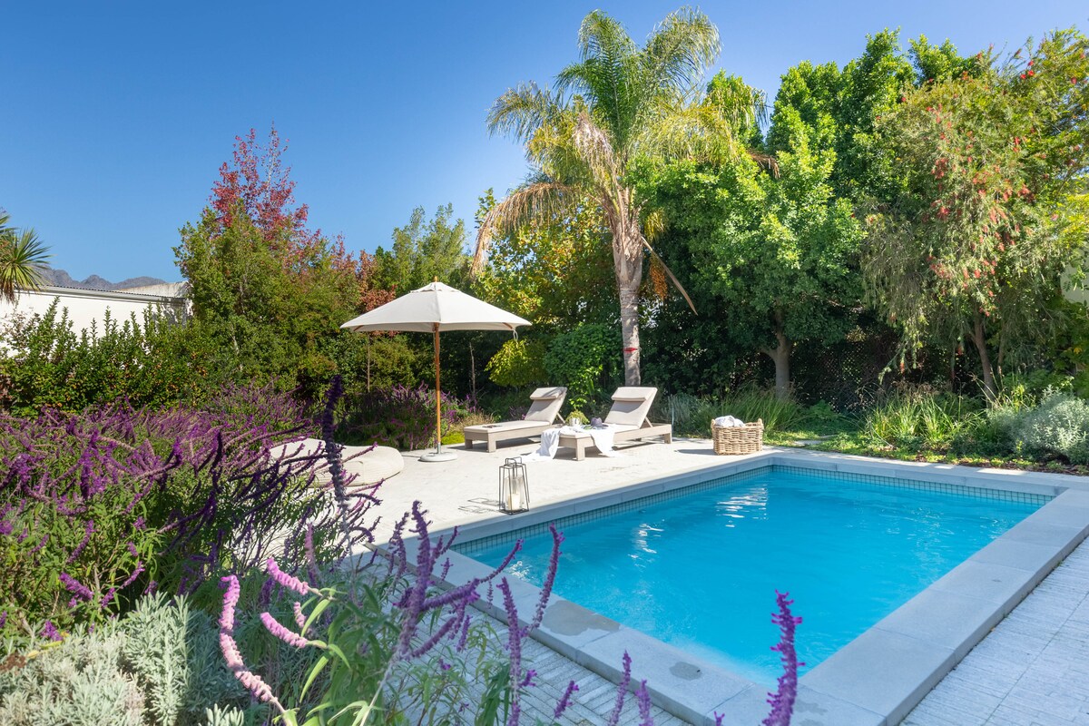 The perfect holiday home in one of the most beautiful towns in the Cape. This Cape Dutch cottage has been fully restored and designed in a classic contemporary style with all the modern day conveniences. It's stylish but warm and nestled in the most beautiful large garden with a beautiful swimming pool, surrounded by mature trees to give you perfect privacy. It is walking distance from all the exciting activities of Franschhoek but far enough to be perfectly quiet and serene.