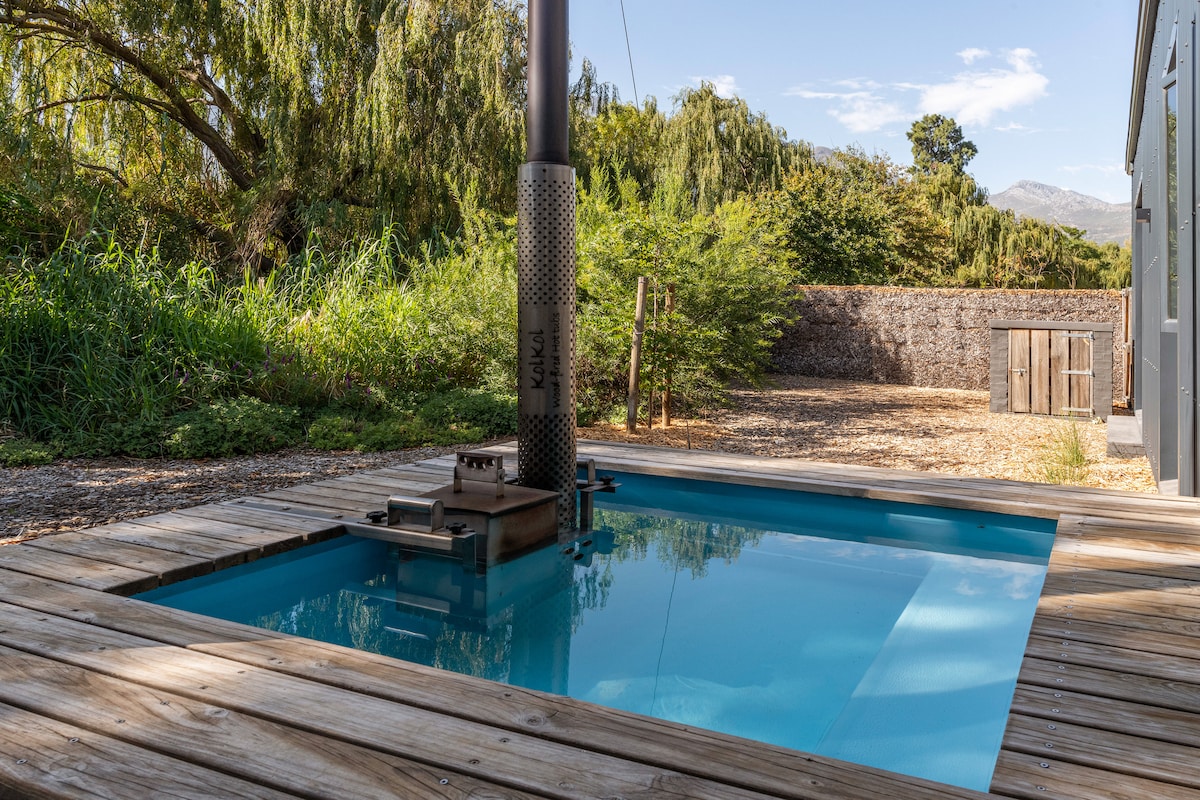 Situated on a small holding 5km outside Franschhoek, opposite the exquisite La Motte Wine Estate, Heidi’s Barn offers the perfect self-catering base from which to explore the Winelands. A fire pit, outdoor dining area and a large swimming pool (shared with one other cottage) are perfect for summertime relaxation while an indoor wood-burning fireplace and wooden floors throughout make for a cosy winter escape. The barn runs on mains power with solar back up for load shedding.