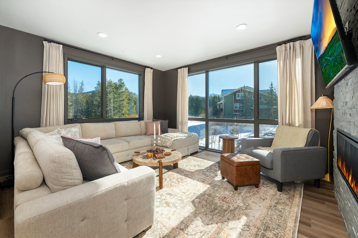 Brace yourself for the ultimate Rocky Mountain experience during your stay at this brand new, mountain-view condo in Fraser. This luxury 2 bedroom/2 full bathroom condo sleeps up to 8 people comfortably. The condo includes a master bedroom with king bed and ensuite full bath, a second full bathroom with bathtub/shower combination located in the hallway, a second bedroom with queen bed, a flex space with a twin over twin bunkbed, a sleeper sofa in the living room, and a pack-n-play portable crib.