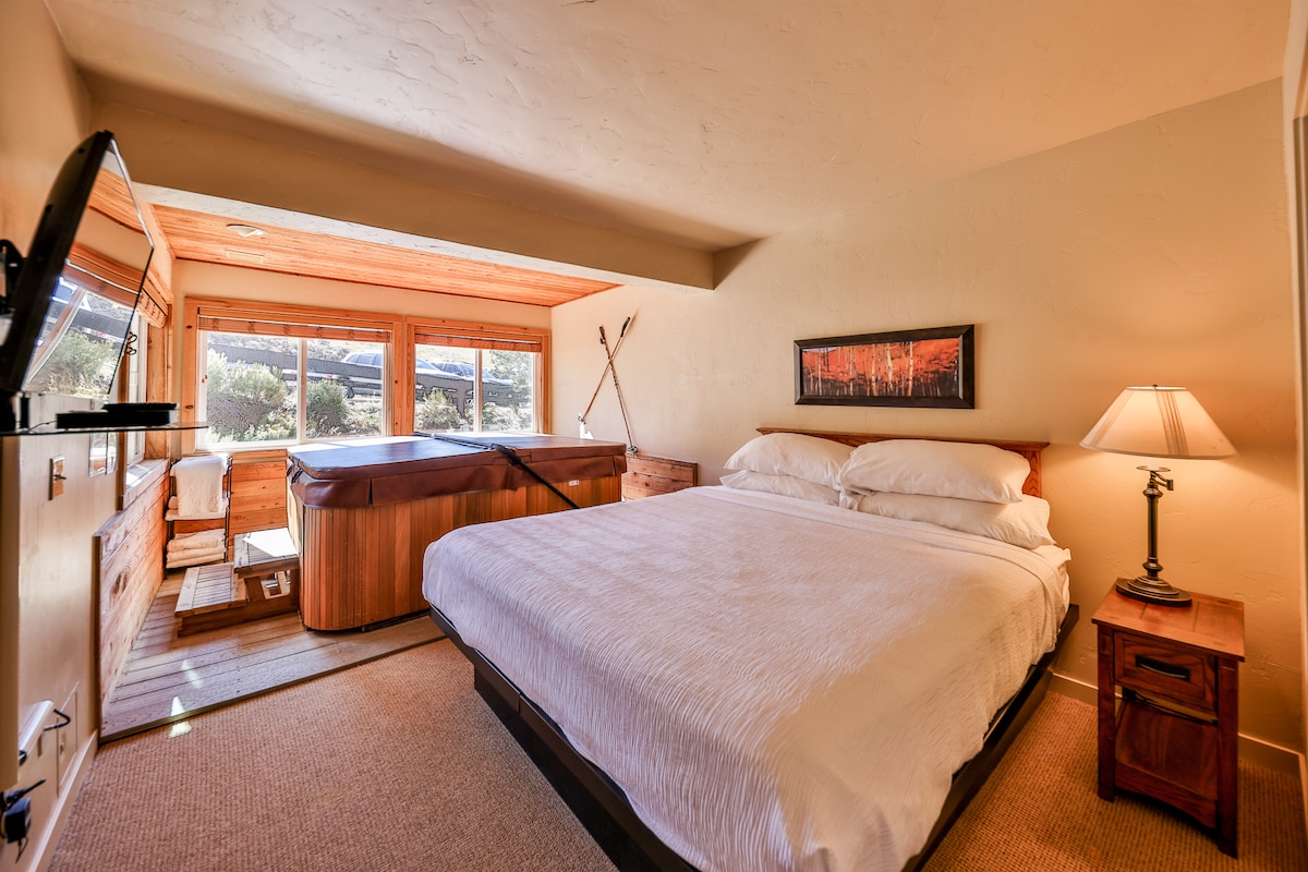 单卧室公寓,滑雪进出,热水浴缸,火坑