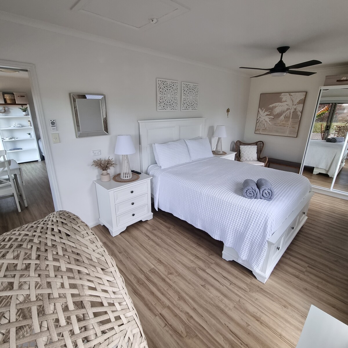 Palm View is a 1 bedroom unit. with a private entry. You have your own bathroom, open plan, kitchen, and dining. It comes with ducted air con and ceiling fans. The sliding door leads out onto the private courtyard with outdoor furniture. The magnesium mineral pool feels silky and smooth on your skin and can help ease your aches and pains, a great way to relax and unwind. The pool is a shared space. There is also another outdoor area next to the pool to relax or have a barbeque.