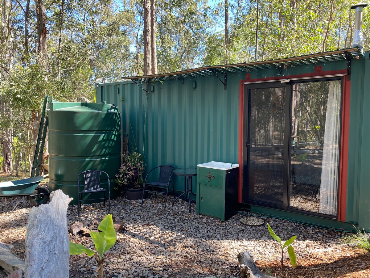 This eco-friendly, repurposed shipping container surrounded by eucalyptus trees & wildlife offers a peaceful escape. Inside is surprisingly cozy, with soft bedding, a small kitchenette & dining area, shower & large doors that bring the sights and sounds of the bush indoors. The air is filled with the hum of cicadas & the calls of the kookaburras among many wild birds. Perfect for those who want to blend a bush getaway with coastal beauty - a scenic, dirt track out to the iconic Rainbow Beach.