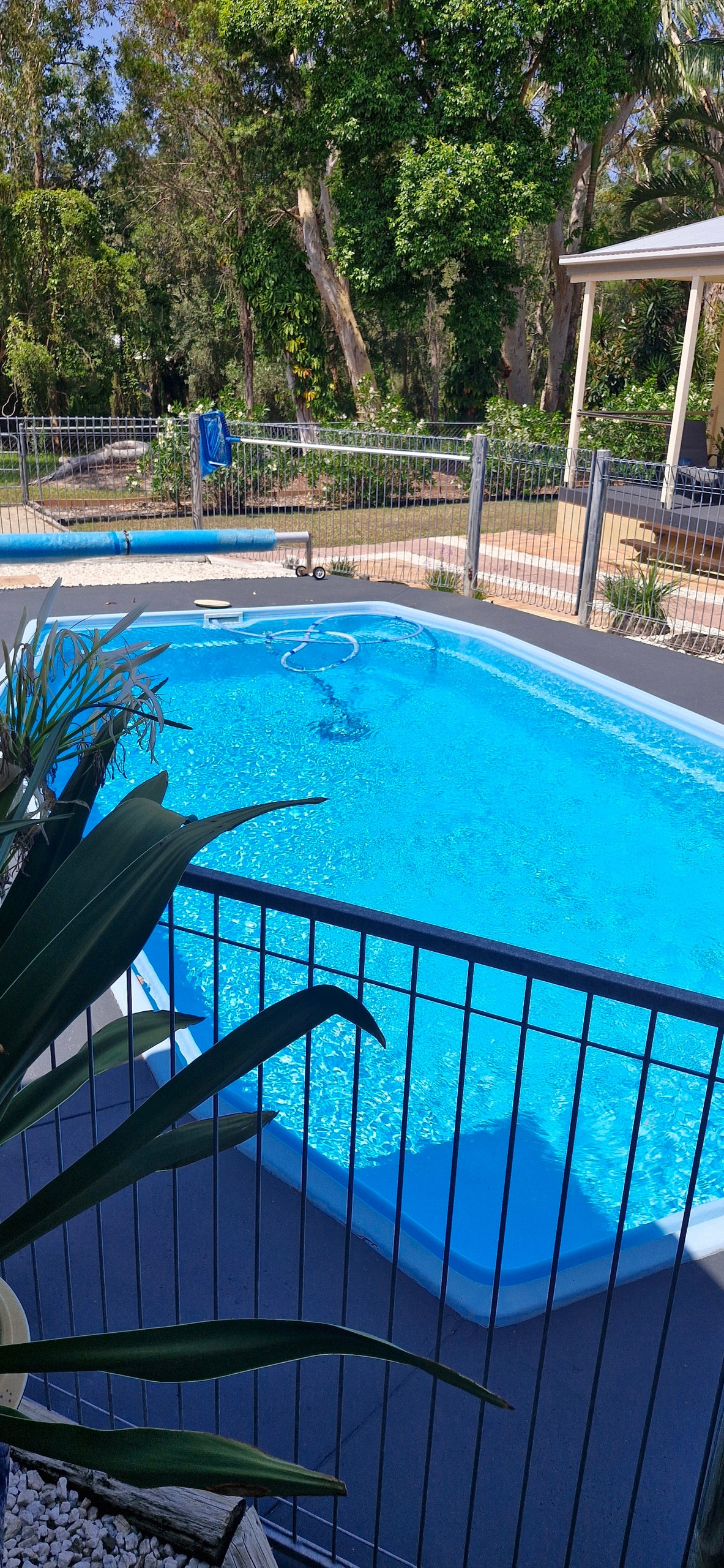 Palm View is a 1 bedroom unit. with a private entry. You have your own bathroom, open plan, kitchen, and dining. It comes with ducted air con and ceiling fans. The sliding door leads out onto the private courtyard with outdoor furniture. The magnesium mineral pool feels silky and smooth on your skin and can help ease your aches and pains, a great way to relax and unwind. The pool is a shared space. There is also another outdoor area next to the pool to relax or have a barbeque.
