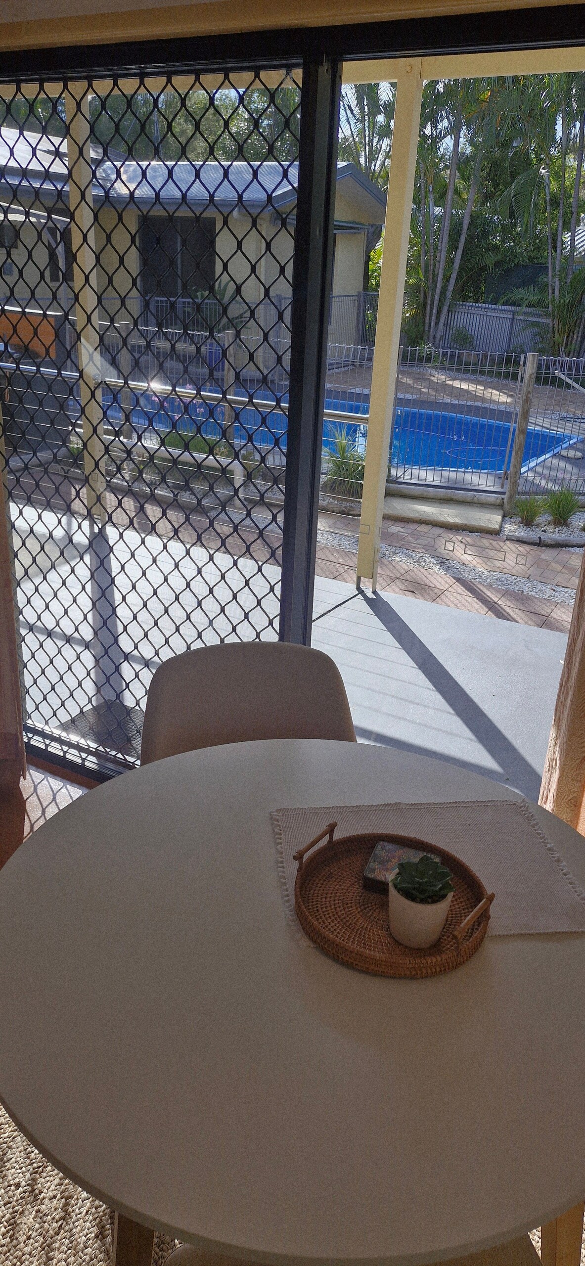 Palm View is a 1 bedroom unit. with a private entry. You have your own bathroom, open plan, kitchen, and dining. It comes with ducted air con and ceiling fans. The sliding door leads out onto the private courtyard with outdoor furniture. The magnesium mineral pool feels silky and smooth on your skin and can help ease your aches and pains, a great way to relax and unwind. The pool is a shared space. There is also another outdoor area next to the pool to relax or have a barbeque.