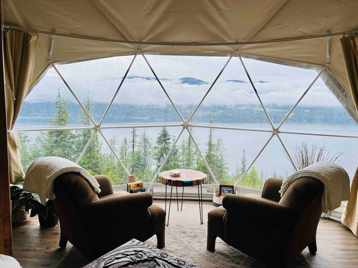 Perched high above Shuswap Lake, this cozy, yet luxurious geodesic sky dome offers an amazing off-grid glamping experience surrounded by nature. Fall asleep under the stars and wake up overlooking Shuswap lake! Located on 30 private acres, we are located just 5 minutes from the beach, and 10 minutes from town. **THIS PROPERTY IS AN OFF-GRID EXPERIENCE. THERE IS NO POWER, FRIDGE OR SHOWER FACILITIES ON THE SITE** Enjoy the wood-burning hot tub with panoramic views of the forest and lake