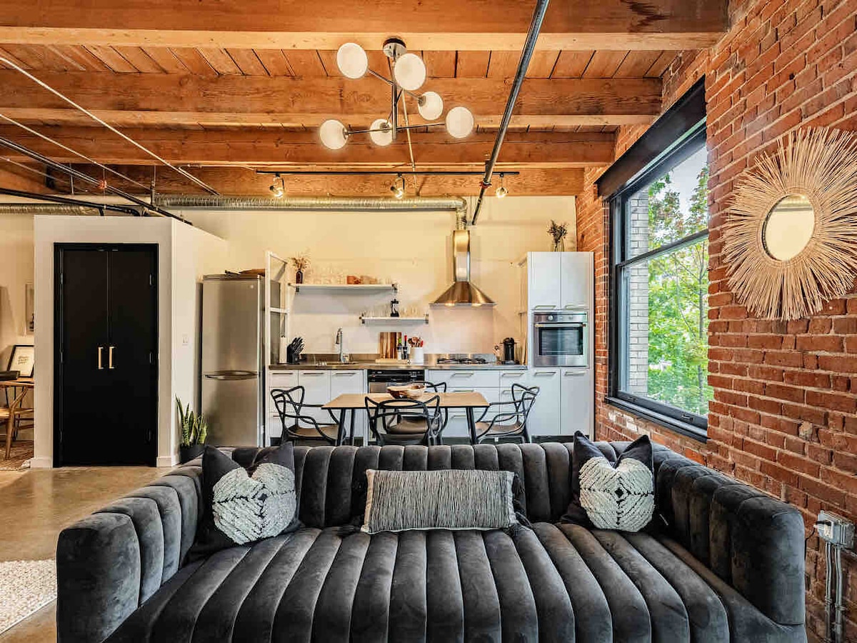 Discover a distinctive retreat designed for comfort and character in this thoughtfully curated open-concept apartment. Enjoy music on the record player as you soak in the ambiance of exposed wood beam ceilings, beautifully restored brickwork, and refined industrial details. Blending rustic charm with modern comfort, this inviting space offers a peaceful escape perfect for relaxing, recharging, and feeling at home.