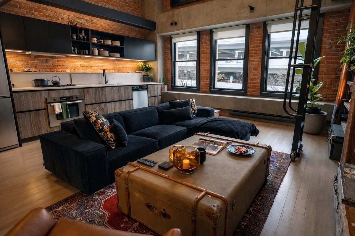 Welcome to my beautiful 1200 sq ft. New York style loft in downtown Vancouver's Gastown! This place is a true, fully stocked, home away from home with comfortable and stylish furnishings. Sit back on your couch and 58 inch smart TV, cook a meal in the fully stocked kitchen with a gas stove top, or enjoy a relaxing bath in your blue bathtub - the options are endless! Plus in-suite laundry (washer & dryer)!