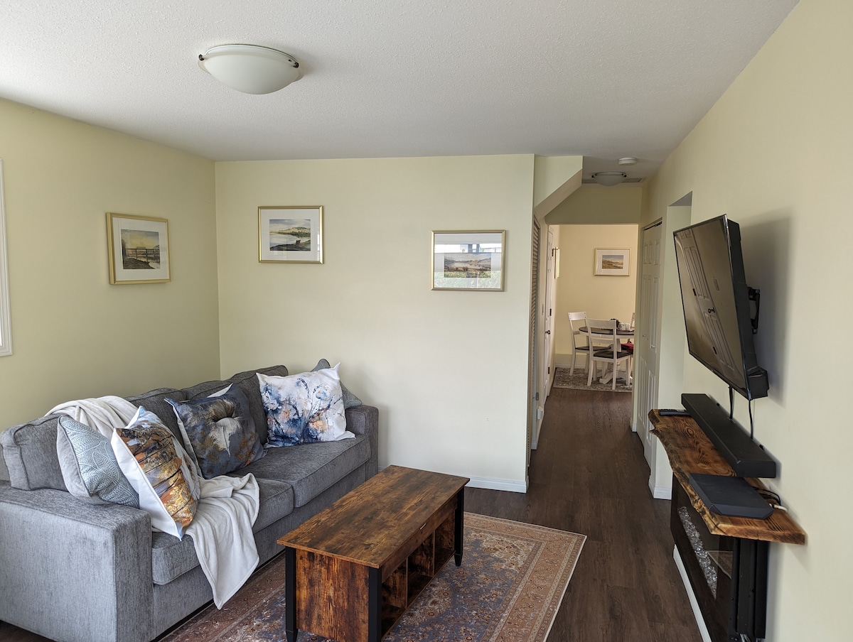 Barrel sauna, fire table, patio, 45 min to Sun Peaks- winter ready! King Suite delivers comfort for couples, solo or business travelers. Full kitchen set up, in suite laundry and FAST WIFI , ready for work or play. Start mornings right with a FREE BREAKFAST and coffee bar then unwind on your private patio with a fire table, bbq, and dreamy backyard. Top it off with a barrel sauna for pure relaxation. Our warm hospitality, privacy and comfort keep guests coming back!