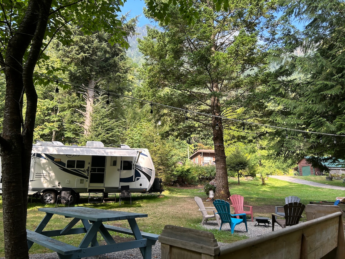 Enjoy the silence and reconnect with nature while exploring the wonders of the Fraser Valley. The semi-secluded and tranquil location of this spacious RV at the base of Mount Brew offers the sound of waterfalls and birds and the opportunity to disconnect from your daily life. Stroll through our organic orchard and pick your own seasonal fruit, herbs and vegetables. Within a 20 minute drive explore historic Lillooet or enjoy a day at Seton or Pavilion L