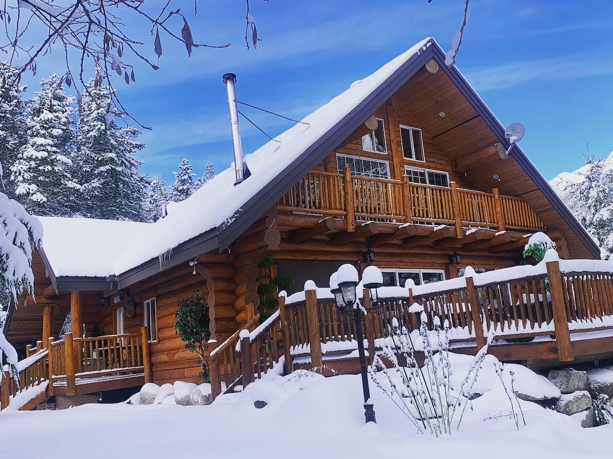 Welcome to the Log Escape, a newly constructed log home in the heart of the Village of Harrison Hot Springs; only an hour’s drive from Vancouver, BC. This state-of-the-art 2,800 square foot smart home sits on a fully fenced 17,000 square foot private property that backs onto the Miami River. The home features easy water access with rich, panoramic views of Mount Cheam and its surrounding landscapes; plus, an easy walk to the Village’s hot springs, pool, beaches, marina, lakes and restaurants.